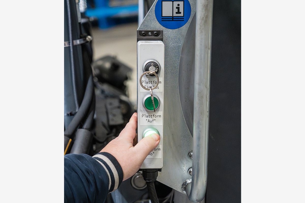 Az átalakítás központi eleme az elektromosan állítható talplemez, amely milliméter pontossággal szabályozható. Ez teszi lehetővé, hogy a kezelőhely magasságban és távolságban is optimálisan illeszkedjen a vezetőhöz. Ezt egészíti ki az egyedileg módosított beszállólépcső, a lehajtható háttámla és a további kapaszkodók. A megoldás karbantartásmentes, ugyanakkor ergonomikus és biztonságos munkakörnyezetet teremt.